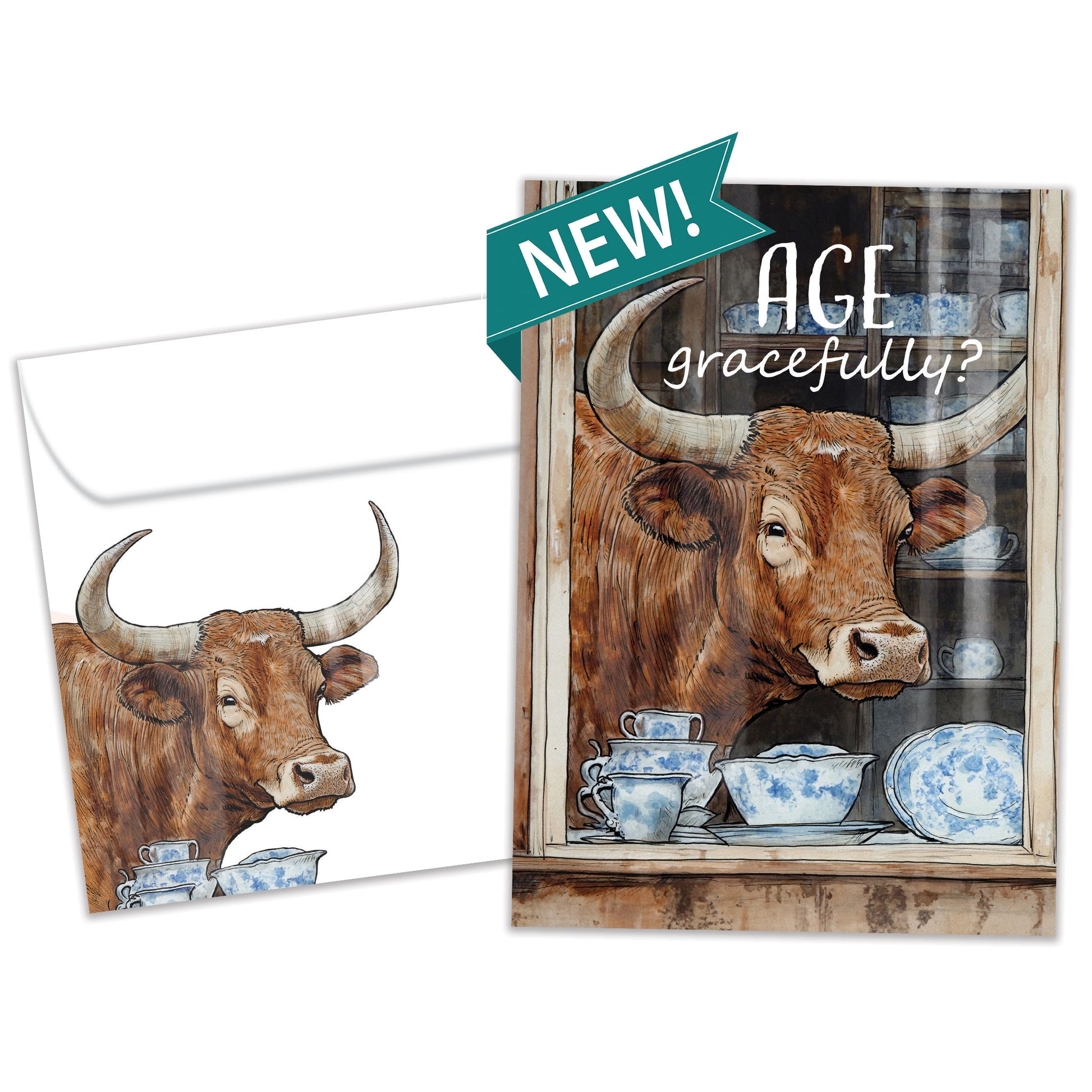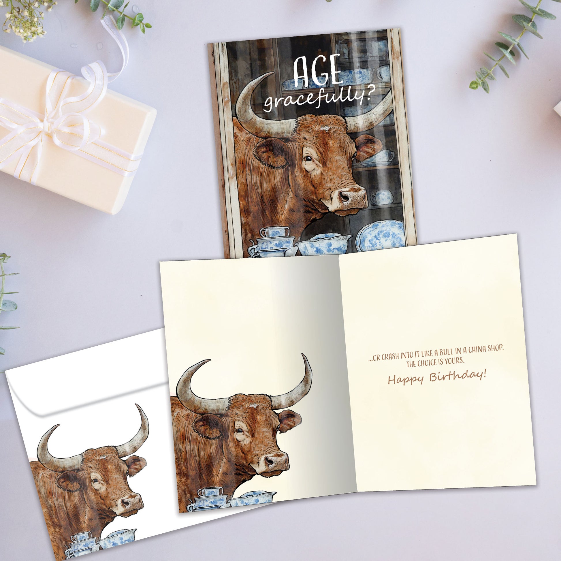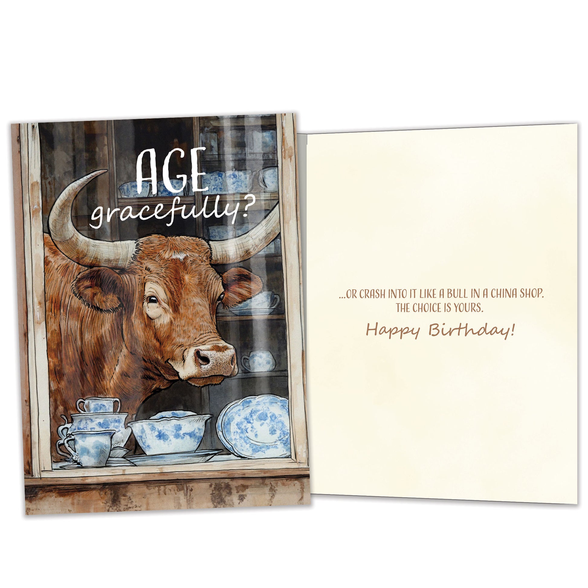 This 5 x 7 Birthday greeting card reads "Age gracefully?" on the cover, and on the inside shares the message "Or crash into it like a bull in a china shop. The choice is yours. Happy birthday!". It features art by Shawn Braley, includes a fully printed matching ARTvelope, and is made from 100% post-consumer recycled material. Proudly made in the Canada.