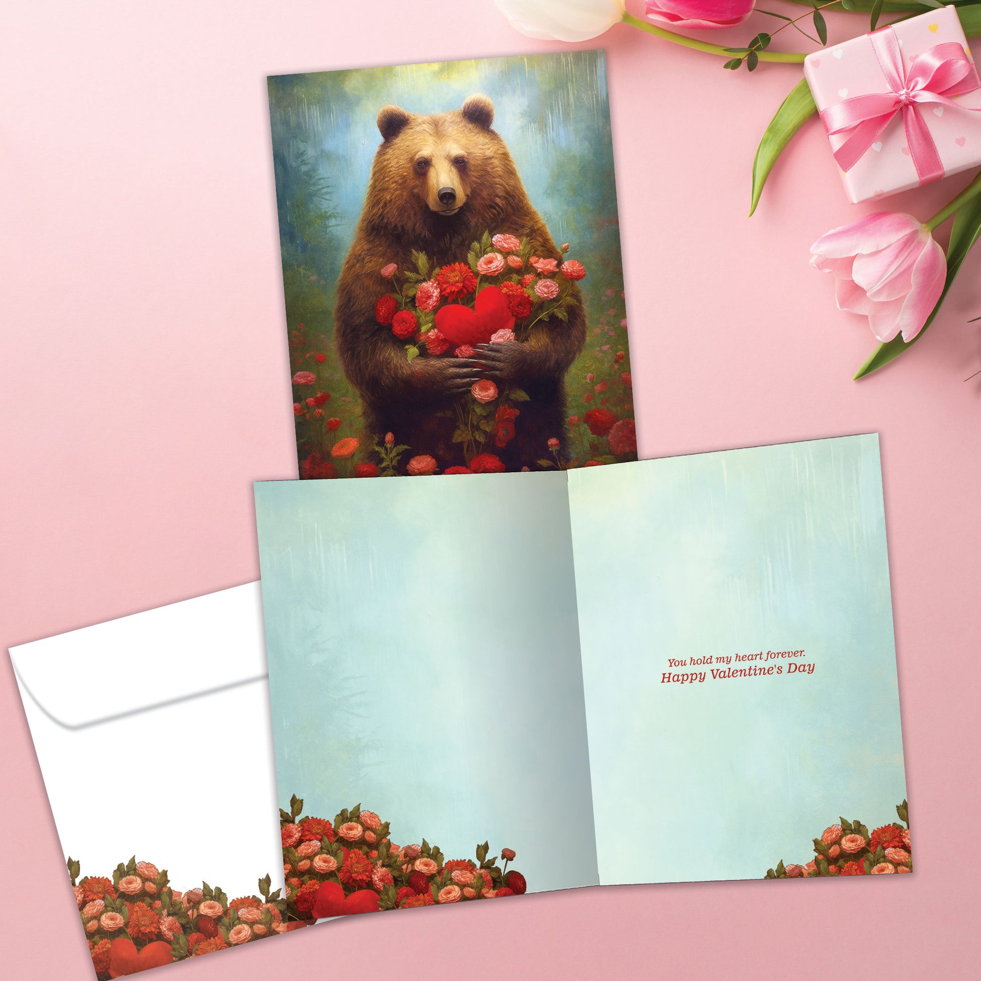 This 5 x 7 Valentine's Day greeting card is blank on the cover, and on the inside shares the message "You hold my heart forever. Happy Valentine's Day". It features art by J.K. Stewart, includes a fully printed matching ARTvelope, and is made from 100% post-consumer recycled material. Proudly made in the Canada.