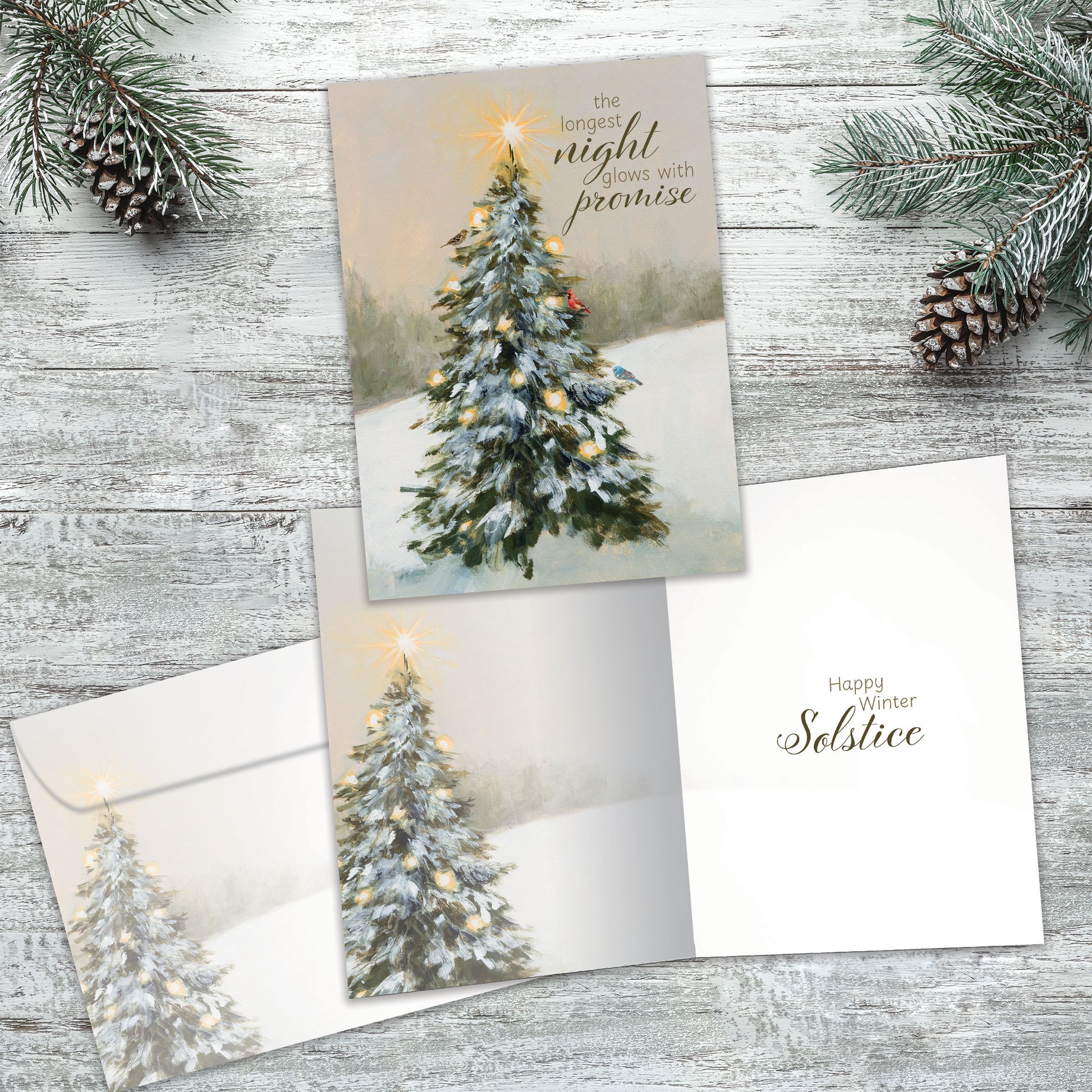 This 5 x 7 Solstice greeting card reads "The longest night glows with promise" on the cover, and on the inside shares the message "Happy winter solstice". It features art by Julia Purinton, includes a fully printed matching ARTvelope, and is made from 100% post-consumer recycled material. Proudly made in the Canada.