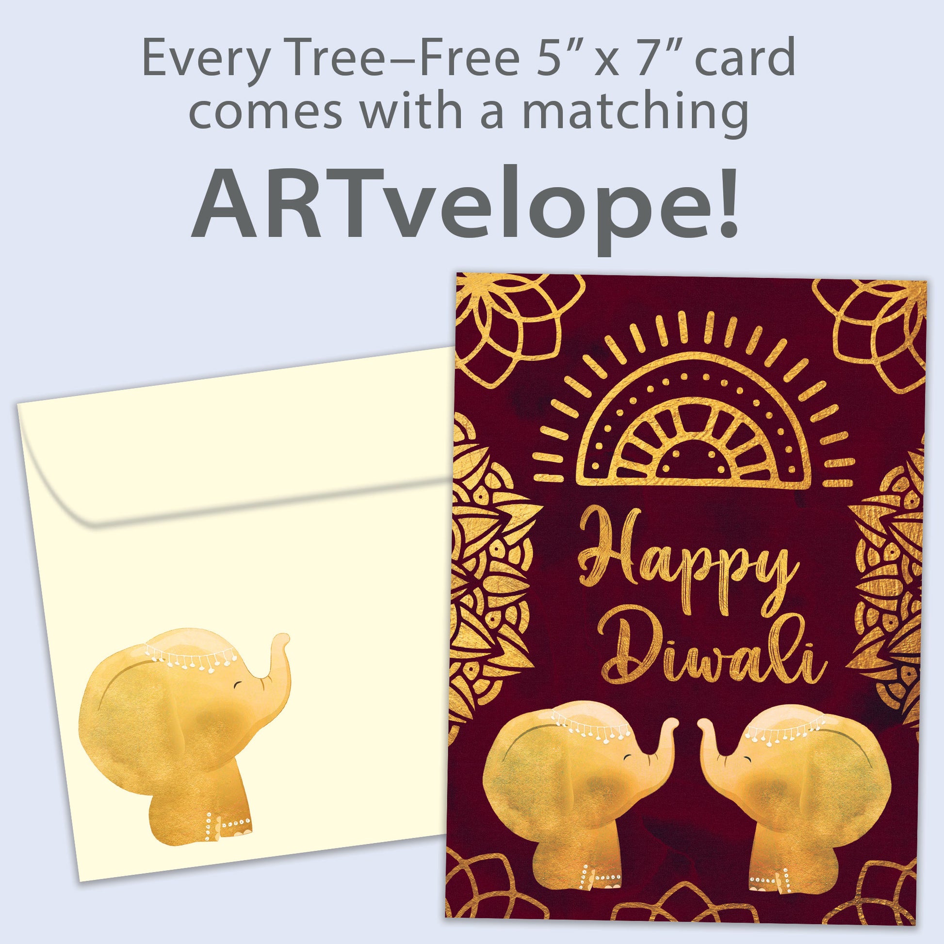 This 5 x 7 Diwali greeting card reads "Happy Diwali" on the cover, and on the inside shares the message "Sending wishes for love, peace, and prosperity!". It features art by Tree-Free Greetings, includes a fully printed matching ARTvelope, and is made from 100% post-consumer recycled material. Proudly made in the Canada.