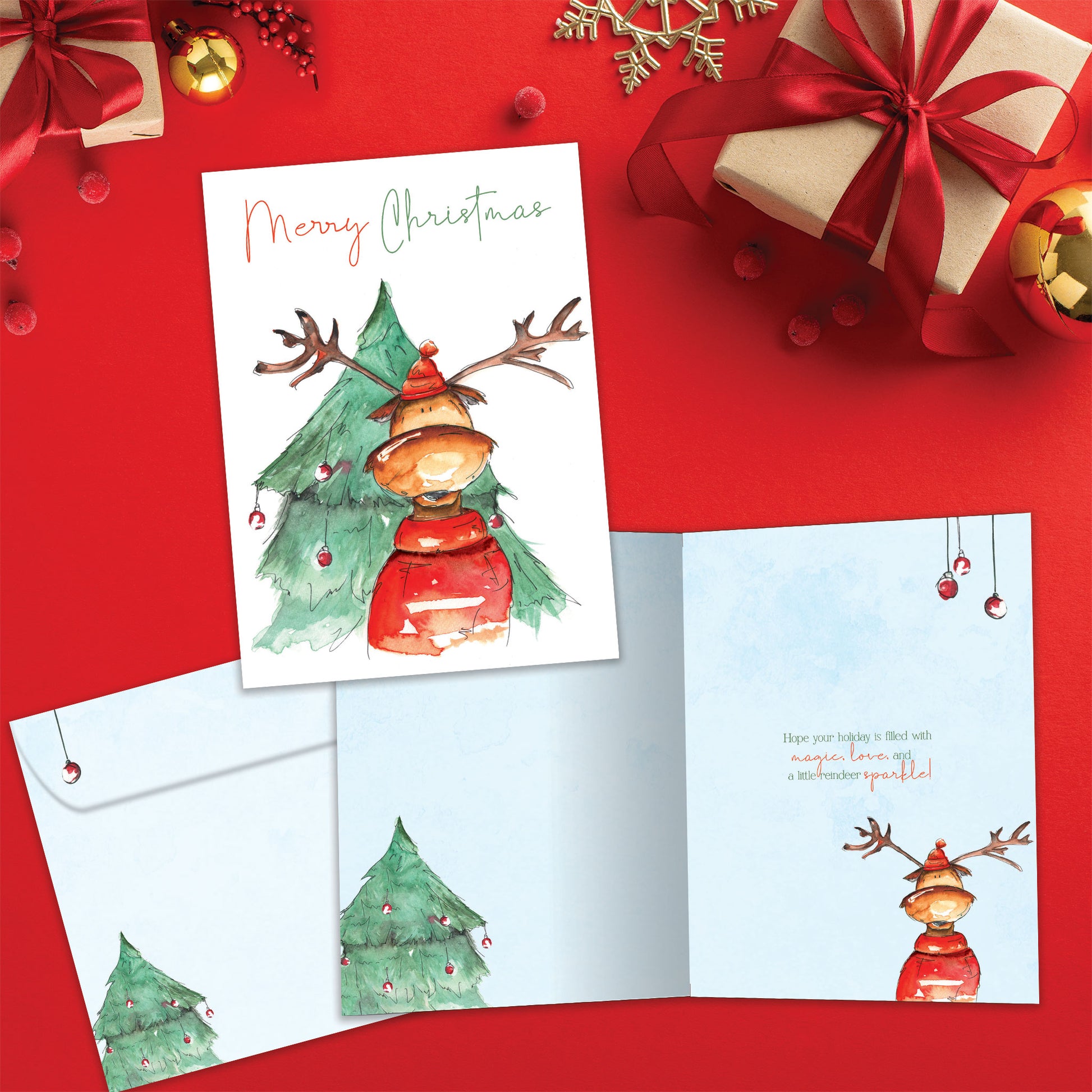 This 5 x 7 Christmas greeting card shares the message "Merry Christmas" on the cover, and on the inside reads "Hope your holiday is filled with magic, love, and a little reindeer sparkle!". It features art by Meg Hawkins, includes a fully printed matching ARTvelope, and is made from 100% post-consumer recycled material. Proudly made in the Canada.