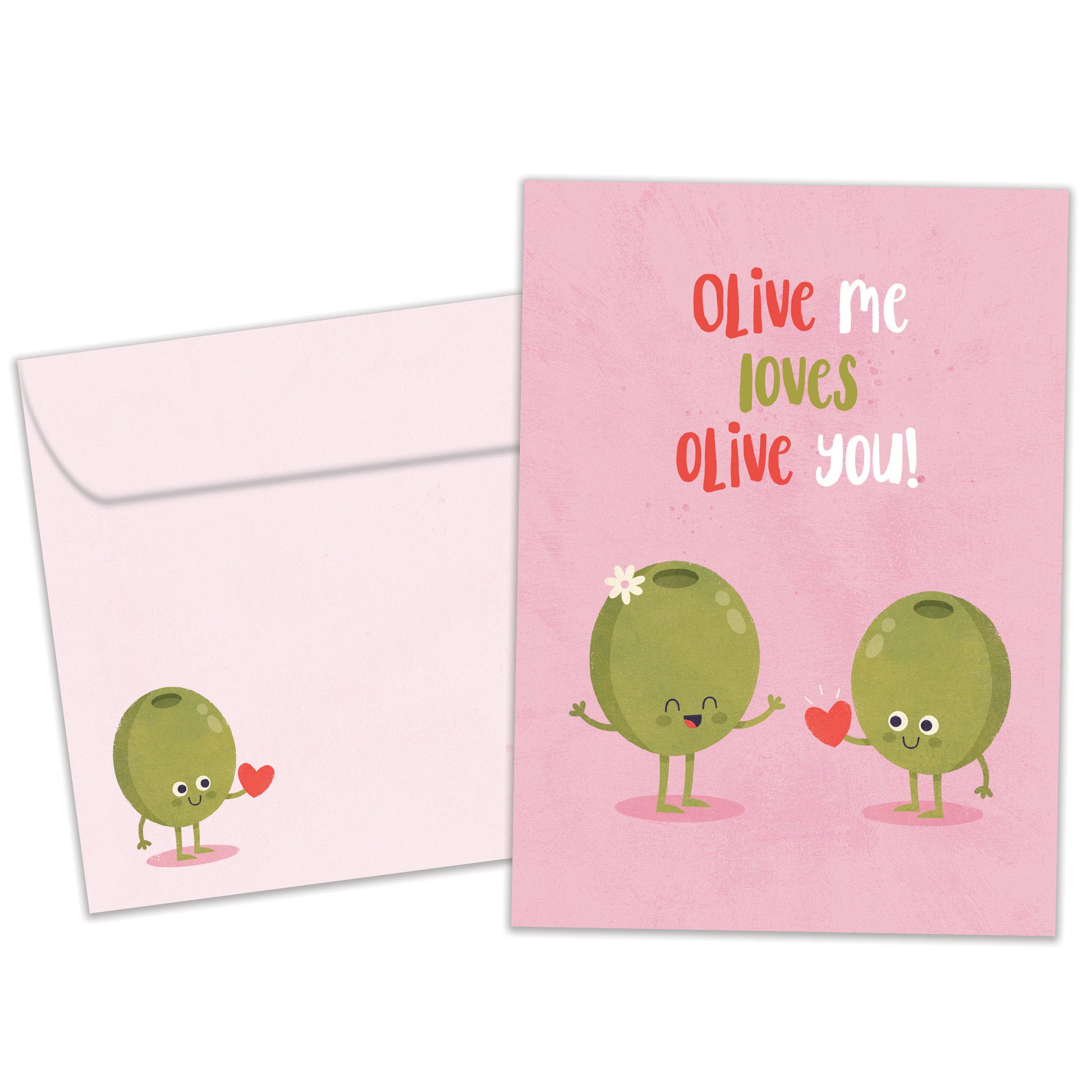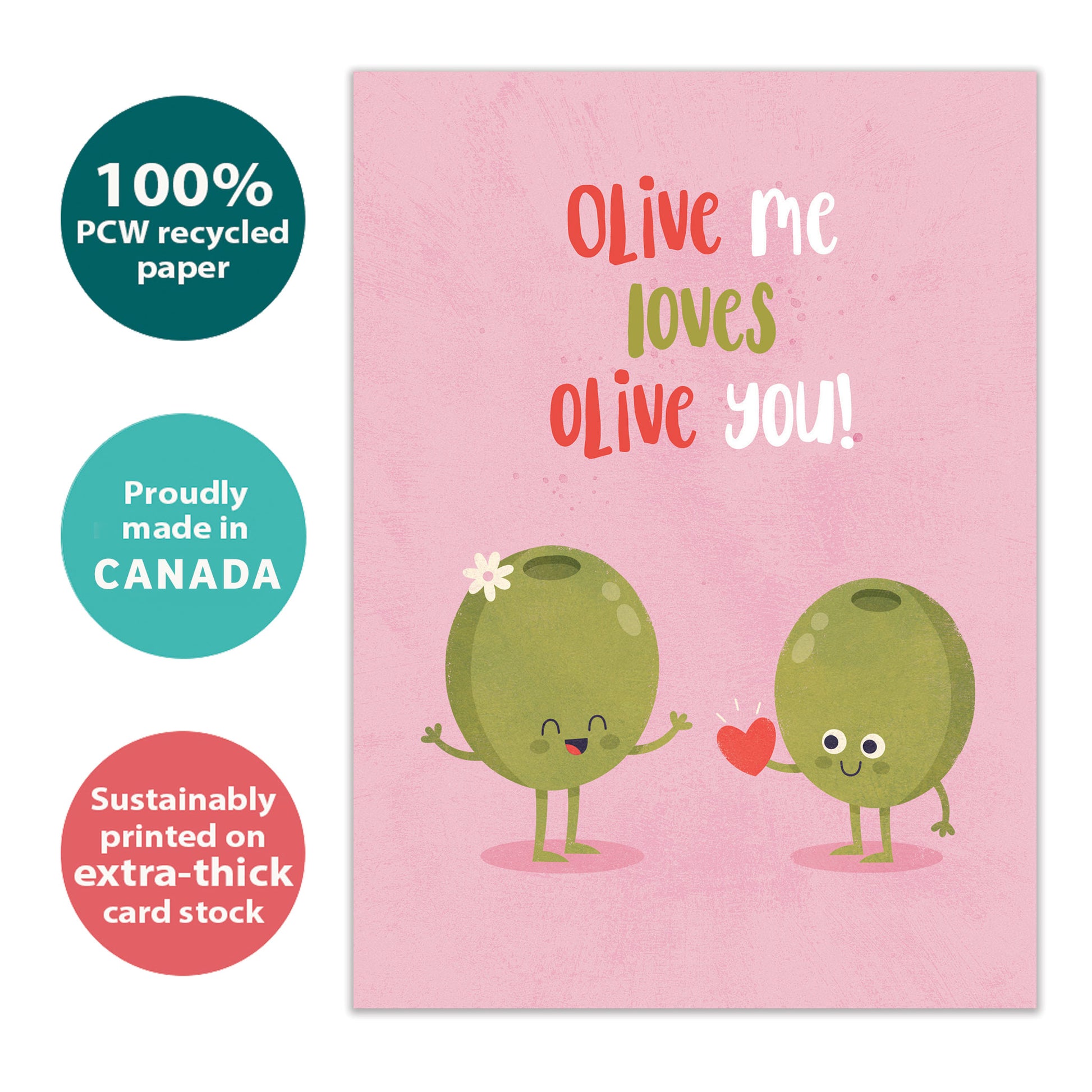 This 5 x 7 Valentine's Day greeting card reads "Olive me loves olive you!" on the cover, and on the inside shares the message "Life with you is never the pits! Happy Valentine's Day". It features art by Gareth Williams, includes a fully printed matching ARTvelope, and is made from 100% post-consumer recycled material. Proudly made in the Canada.