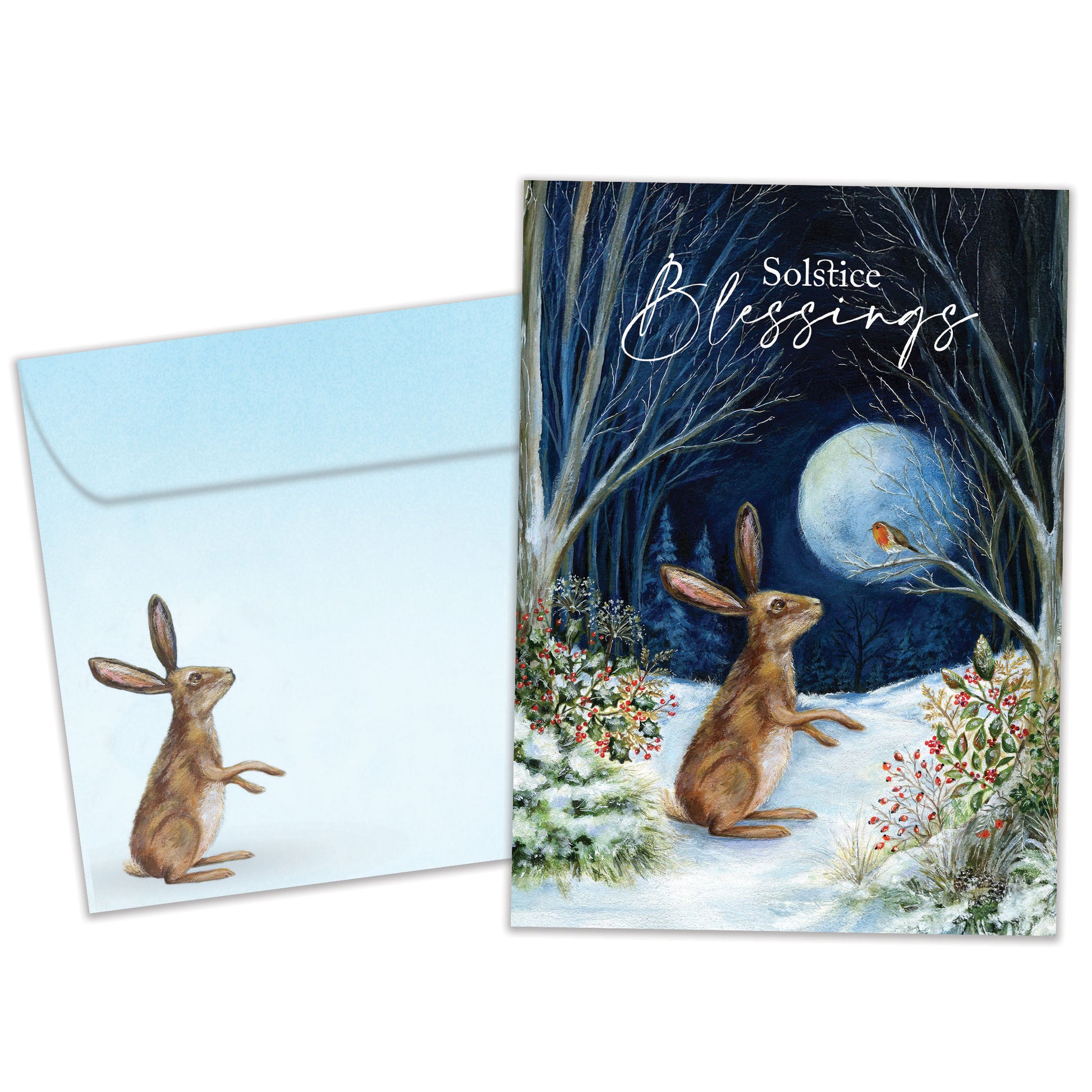This 5 x 7 Solstice greeting card reads "Solstice blessings" on the cover, and on the inside shares the message "Wishing you peace, and quiet joy this Solstice.". It features art by Ileana Oakley, includes a fully printed matching ARTvelope, and is made from 100% post-consumer recycled material. Proudly made in the Canada.