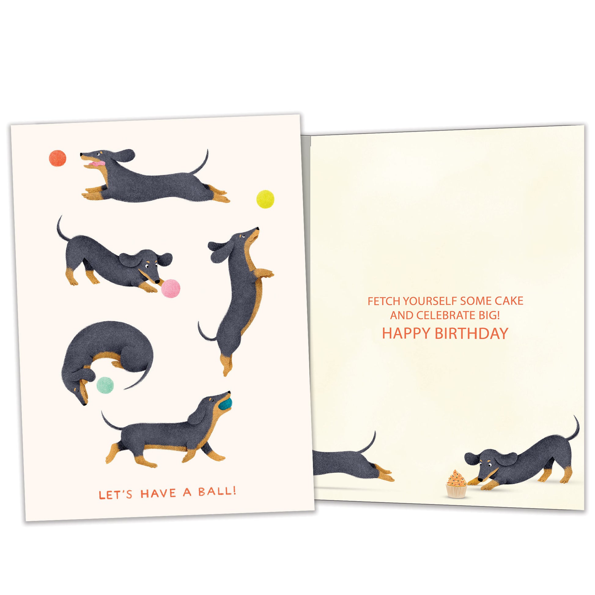 This 5 x 7 Birthday greeting card reads "Let's have a ball!" on the cover, and on the inside shares the message "Fetch yourself some cake and celebrate big! Happy birthday". It features art by Kristen Adam, includes a fully printed matching ARTvelope, and is made from 100% post-consumer recycled material. Proudly made in the Canada.