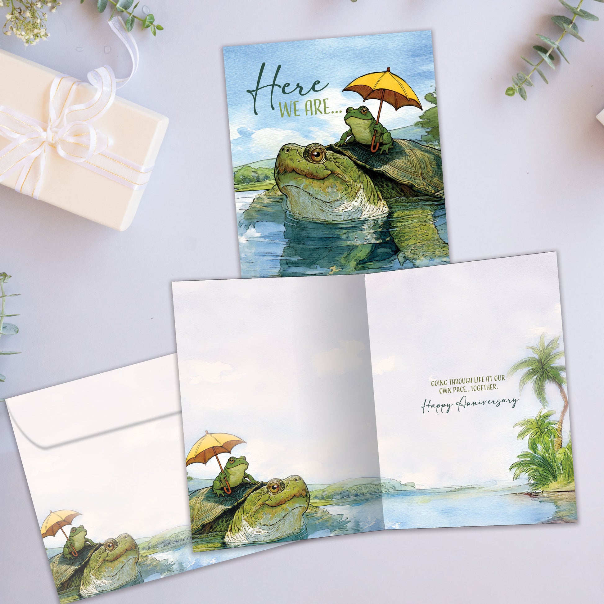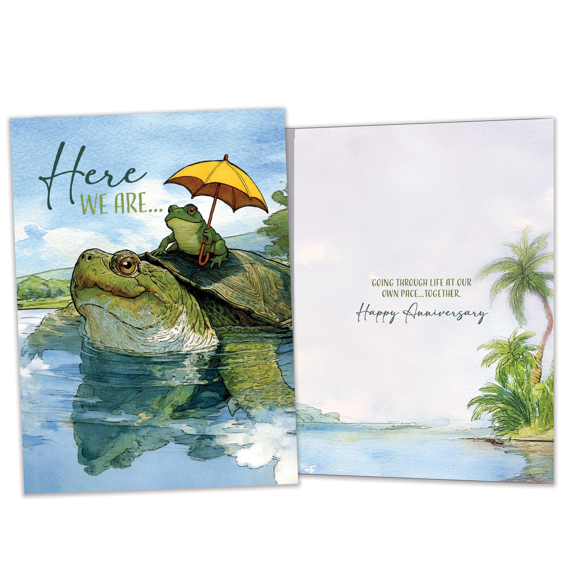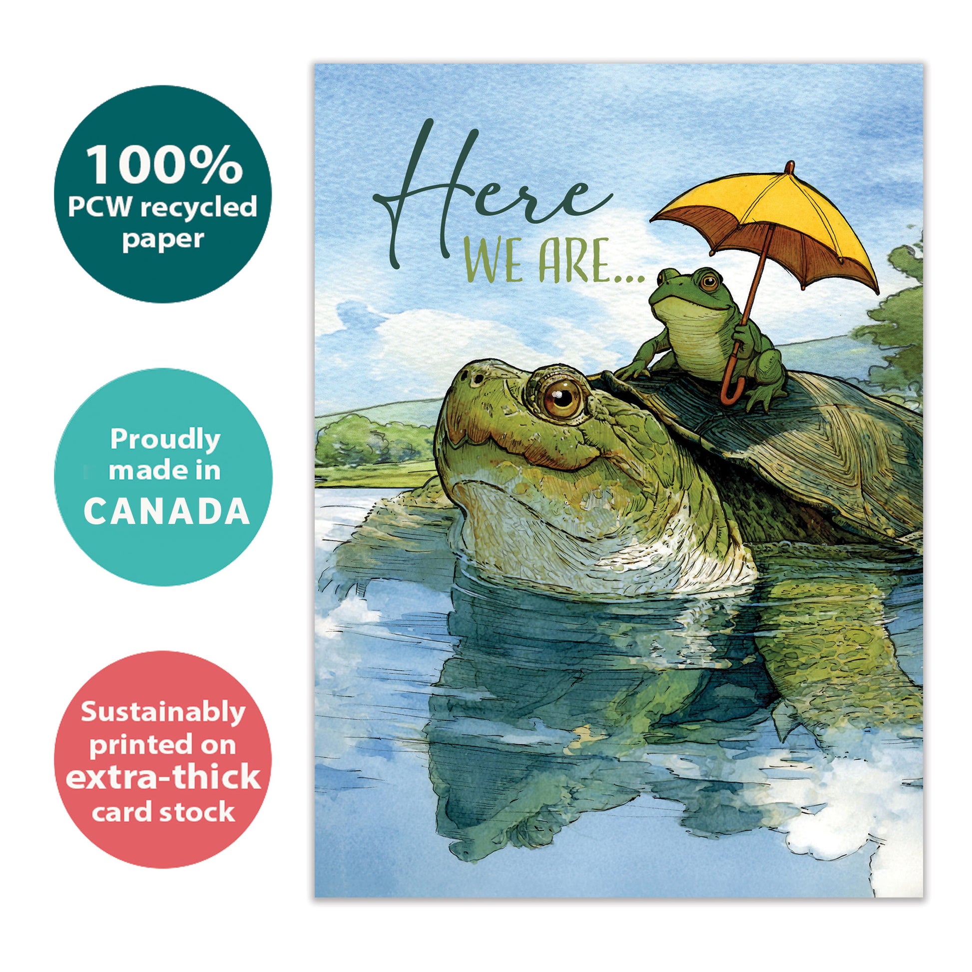 This 5 x 7 Anniversary greeting card reads "Here we are..." on the cover, and on the inside shares the message "Going through life at our own pace...together. Happy anniversary". It features art by Shawn Braley, includes a fully printed matching ARTvelope, and is made from 100% post-consumer recycled material. Proudly made in the Canada.