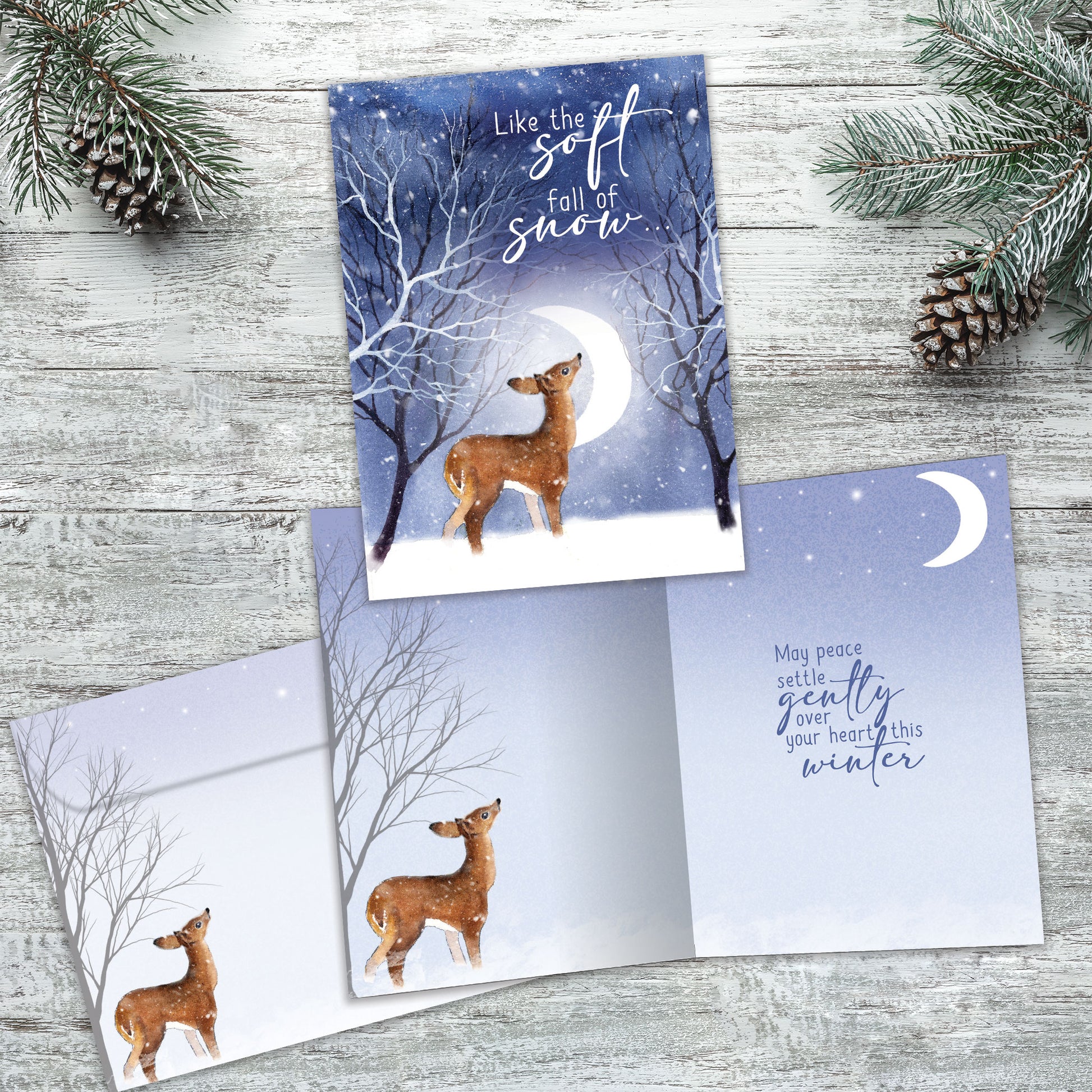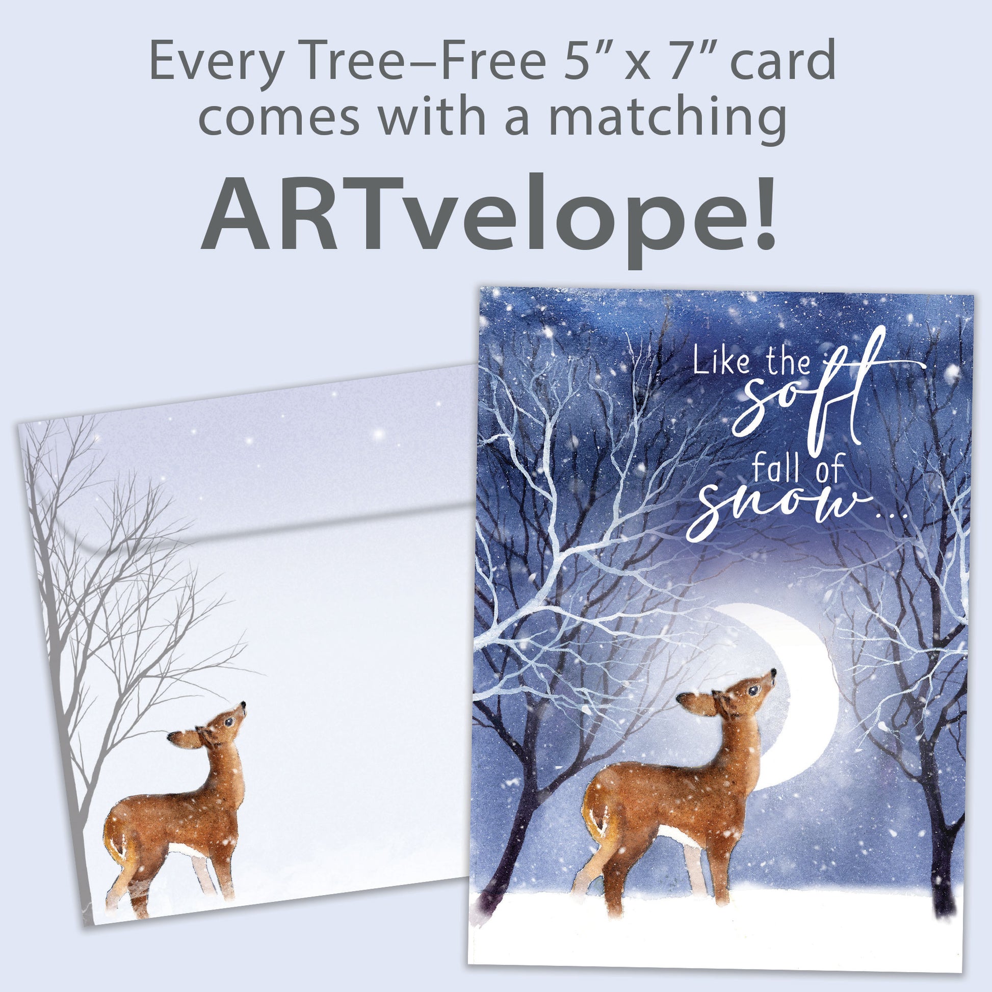 This 5 x 7 Solstice greeting card reads "Like the soft fall of snow..." on the cover, and on the inside shares the message "May peace settle gently over your heart this winter". It features art by Rachel McNaughton, includes a fully printed matching ARTvelope, and is made from 100% post-consumer recycled material. Proudly made in the Canada.
